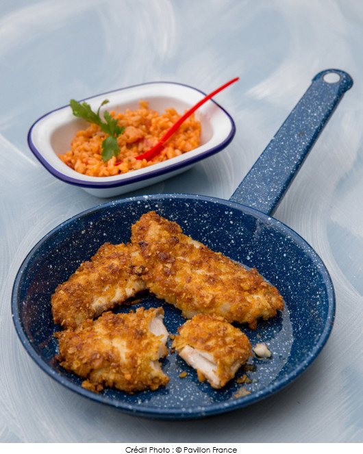⑥• Mettez la farine, l’œuf battu à la fourchette et la chapelure dans 3 bols différents. Passez les morceaux de poisson dans la farine puis dans l’œuf et enfin dans la chapelure. Faites-les cuire à la poêle dans de l’huile bien chaude jusqu’à ce qu’ils soient bien dorés, environ 3 minutes de chaque côté. Égouttez-les sur un papier absorbant.