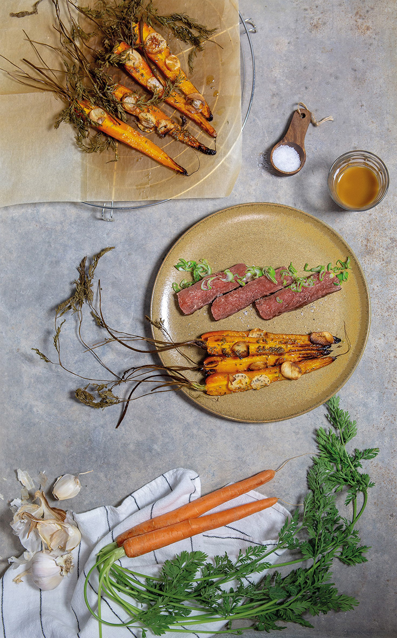 Carottes de créances et rumsteck de bœuf rôti au beurre d’Isigny