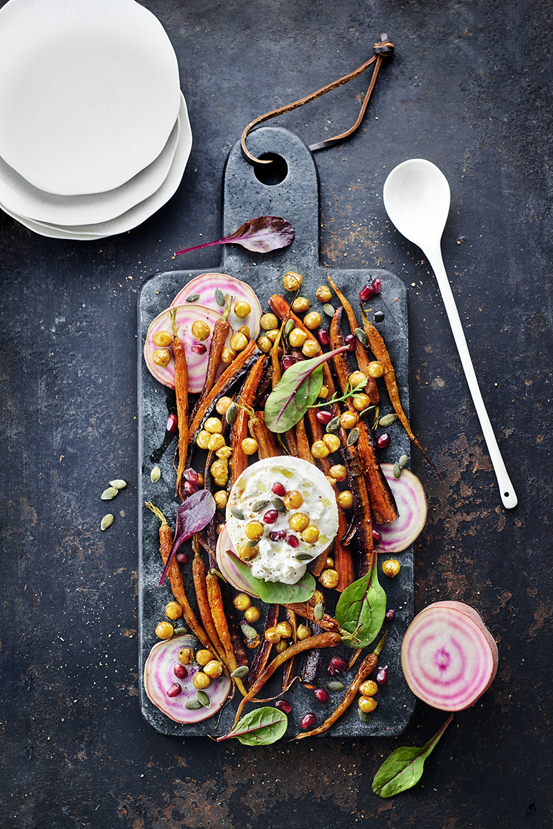 Carottes et pois chiches rôtis au miel, burrata et grenades