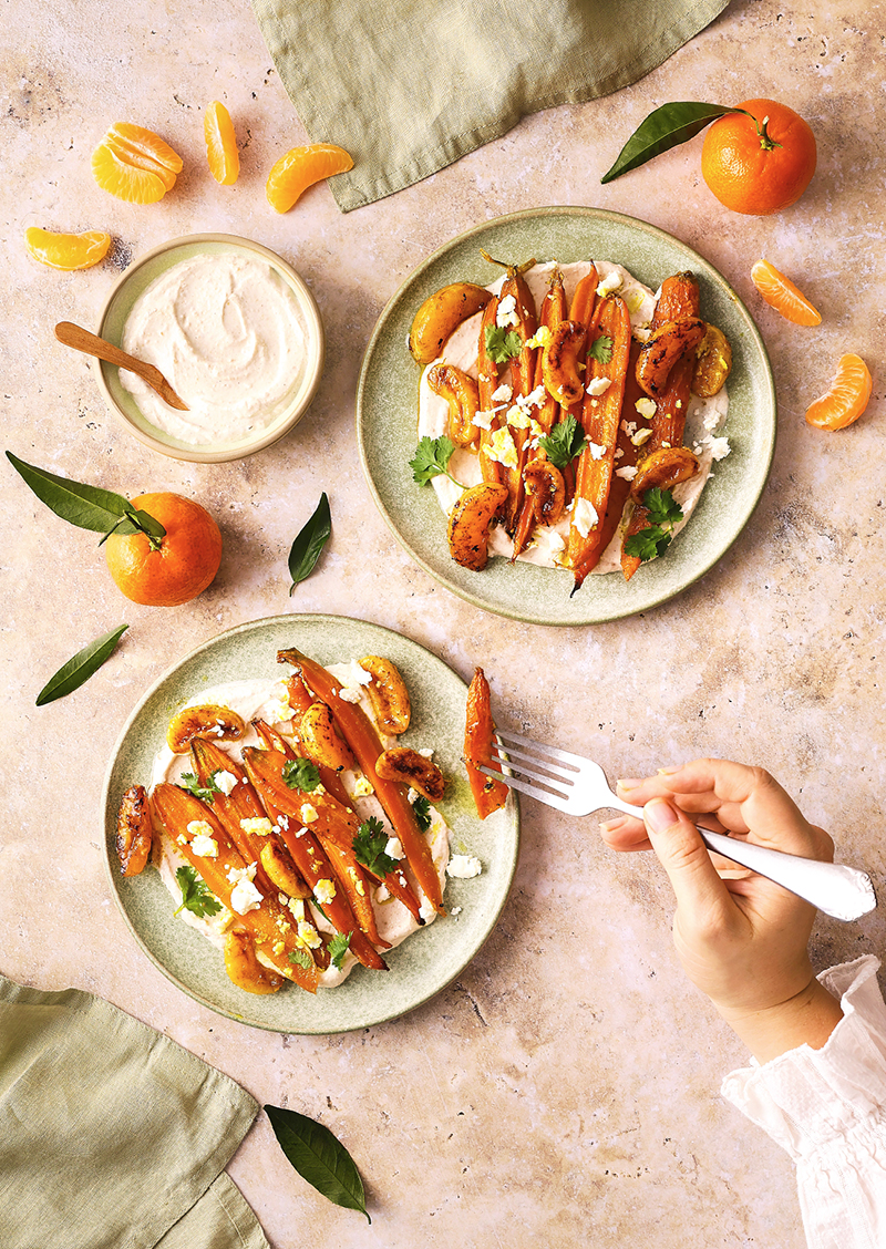 Servir les carottes glacées avec les Clémentines de Corse IGP sur un lit de yaourt avec quelques feuilles de coriandre et un peu de feta émiettée.