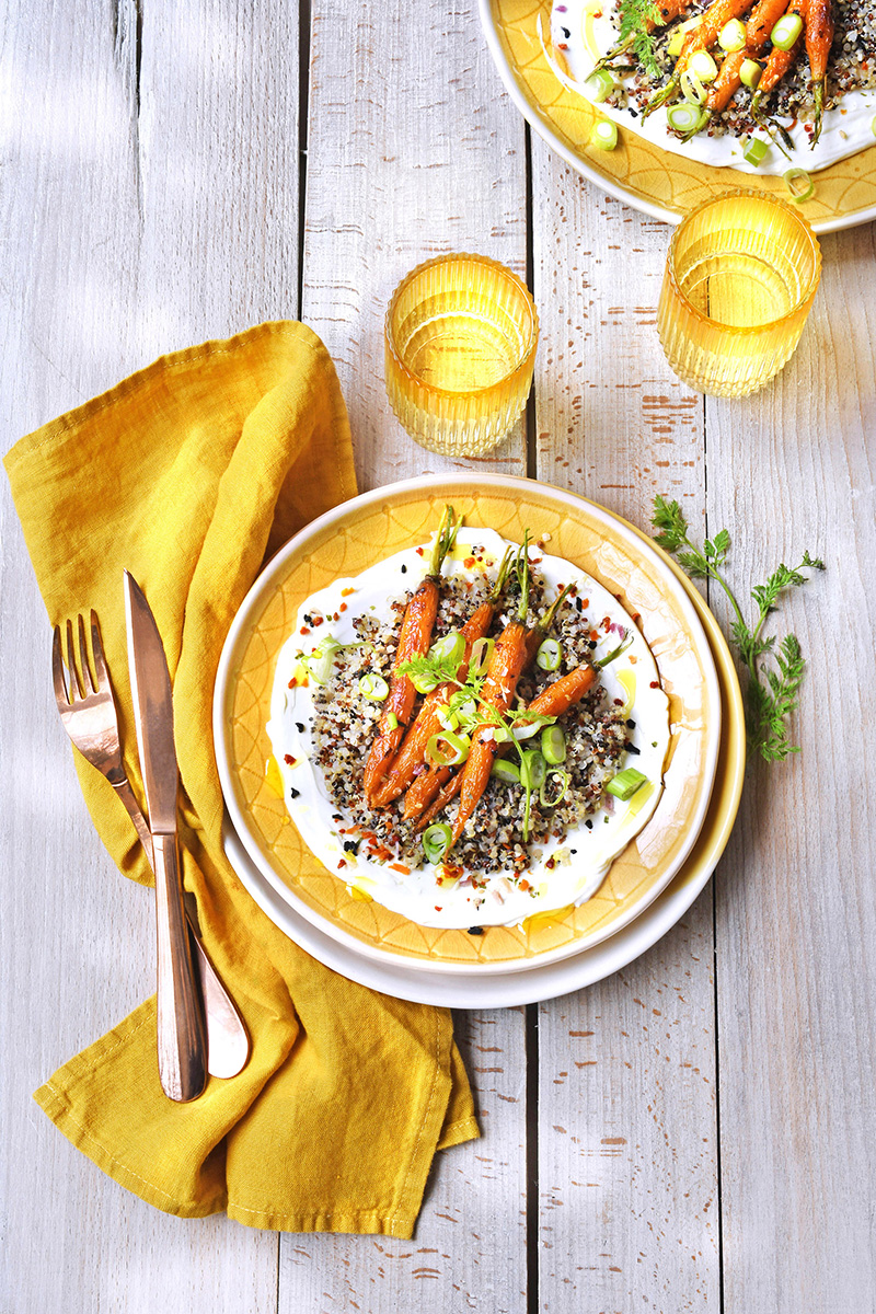 ④• Dresser les assiettes en étalant du yaourt, du quinoa et les carottes sur le dessus. Trancher la cébette et répartir sur les assiettes.