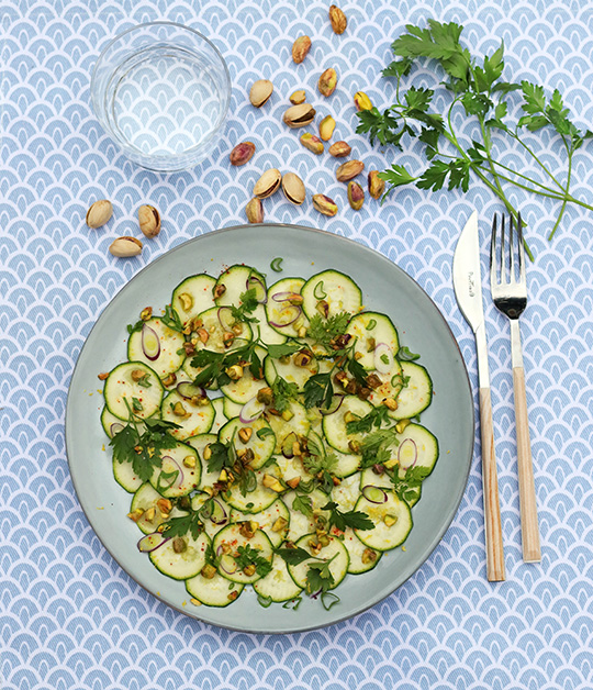 ①• Laver et sécher les courgettes. Ôter les extrémités et les couper en fines tranches à l’aide d’une mandoline.
