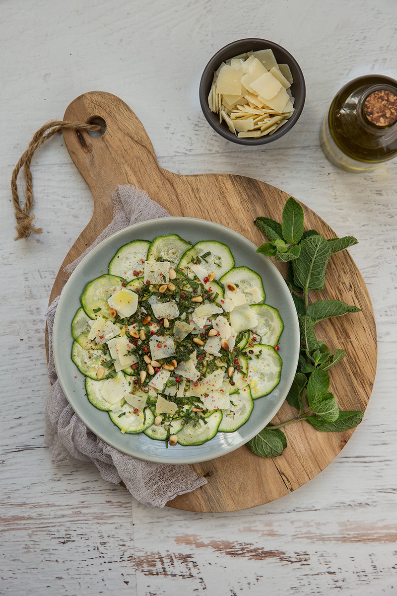 ①• Couper les courgettes à la mandoline afin d’obtenir des fines lamelles.
