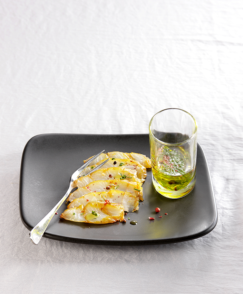 ②• Mélanger l’huile, le jus de citron, la ciboulette rincée et ciselée, les baies roses écrasées un peu avec les doigts et arroser le haddock.