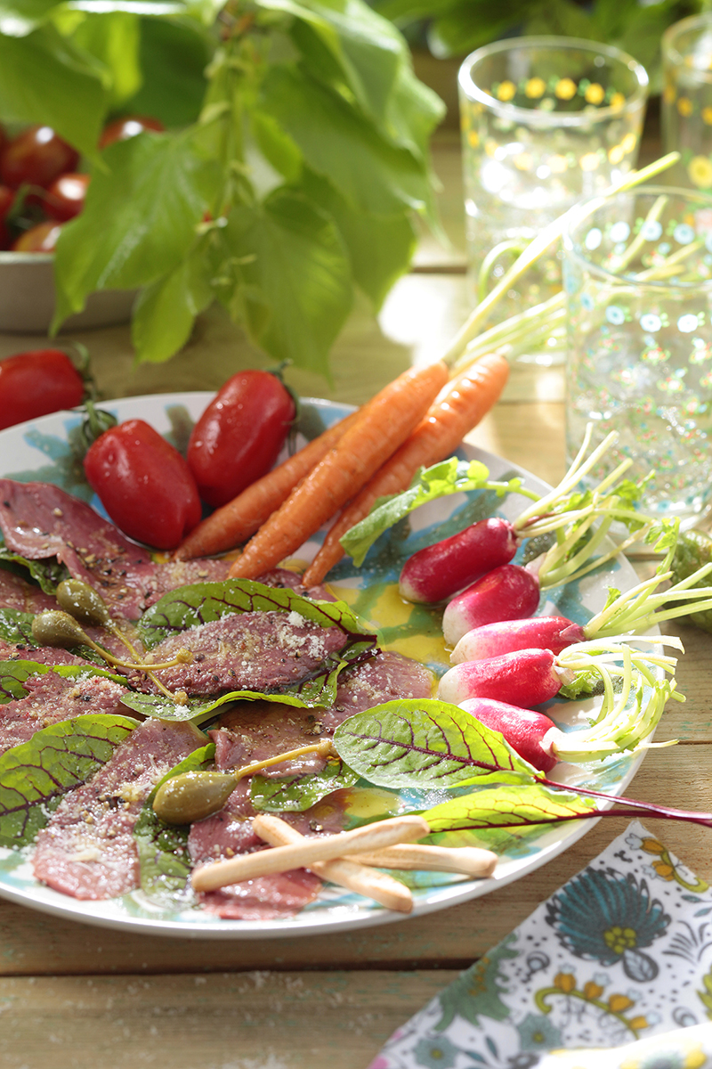 ③• Disposer les tranches en rosace sur 4 grandes assiettes en intercalant le mesclun.