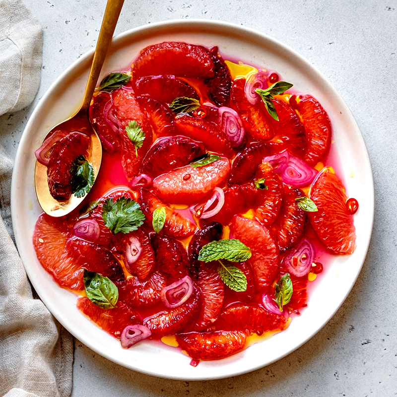 ②• Disposez les dans une assiette, ajoutez l’échalote finement hachée et parsemez de quelques feuilles de menthe.