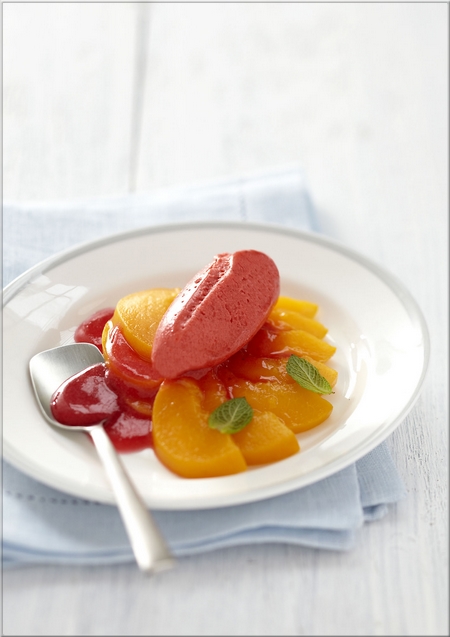Au moment de servir, déposez une quenelle de sorbet sur le carpaccio de pêches, nappez de coulis de groseille et décorez de quelques feuilles de menthe.