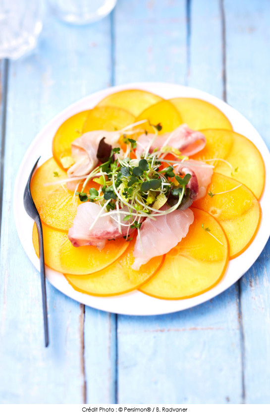 Carpaccio de Persimon® & bar mariné au citron et à la fleur de sel
