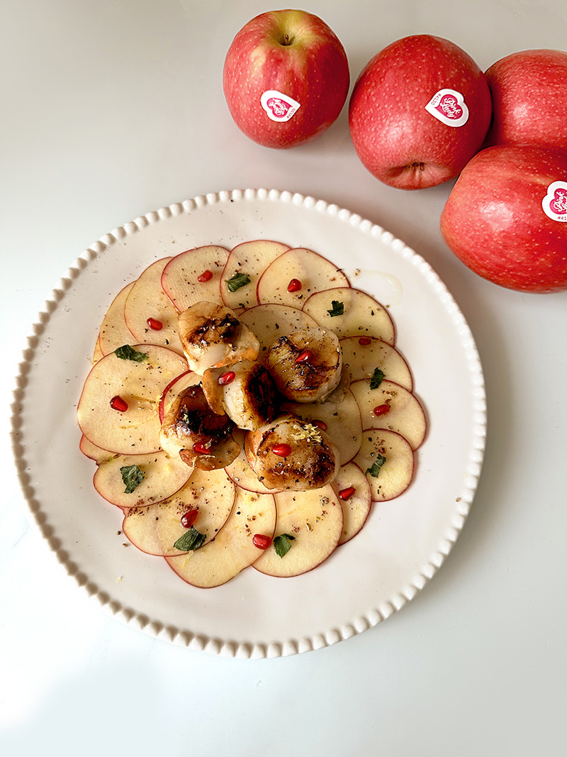 Carpaccio de pommes Pink Lady® et Saint-Jacques snackées