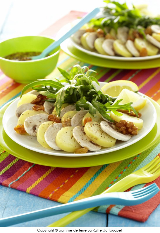 4• Dressez les assiettes en intercalant les tranches de champignons et de Ratte du Touquet, puis disposez la roquette sur le dessus.