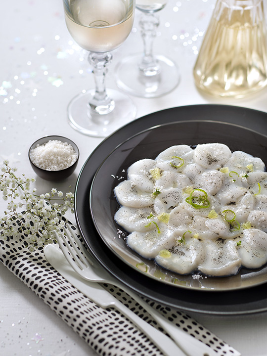 Carpaccio de Saint-Jacques à l’huile de vanille, citron vert et fleur de sel Le Guérandais