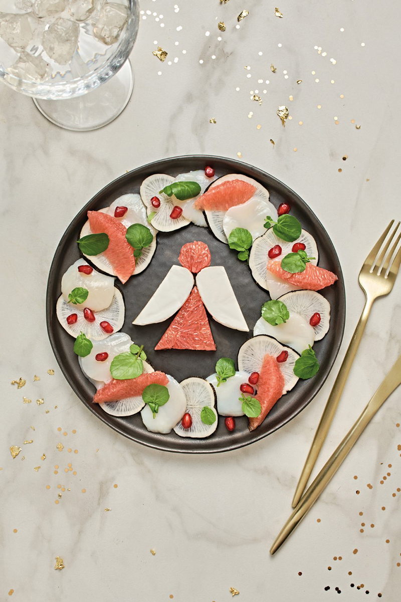 Pour former l’ange : couper en deux le Mini Caprice pour les ailes, couper une tranche de radis noir pour la tête, et utiliser un triangle de pamplemousse pour la robe.