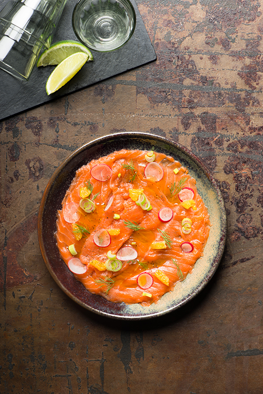 ⑥• Déposer sur le carpaccio, quelques tranches de radis, des morceaux d’orange, de l’aneth et de la cébette.