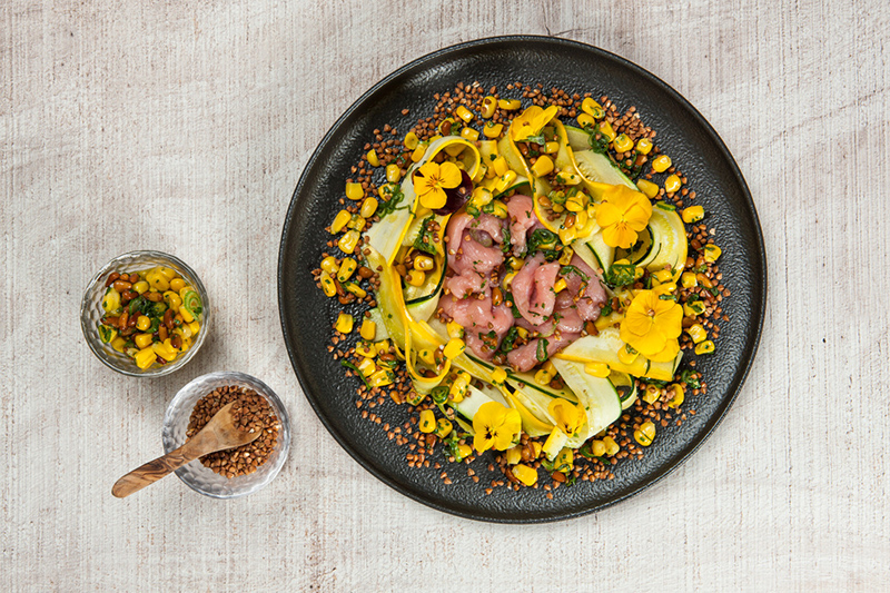 Carpaccio de veau et courgettes, vierge de maïs, sarrasin