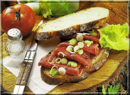Répartir la salade, puis la viande et sa macération, sur 4 tranches de pain. Recouvrir des oignons, puis de tranches de pain.