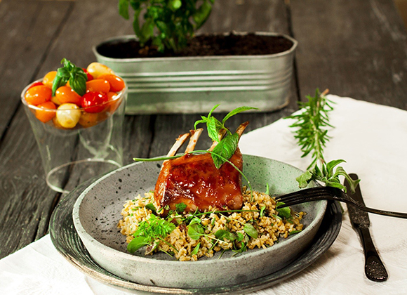 Servir l’orge sur une assiette et disposer le carré d’agneau au centre, par-dessus. Parsemer d’herbes fraîches (basilic, origan, romarin).
