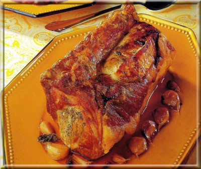 2.Sortir le rôti de la marinade, l'essuyer rapidement et le mettre dans un plat allant au four, faire dorer à four moyen 180°C (th.6) 20 min. Ajouter ensuite un verre d'eau dans le plat ainsi que les gousses d'ail non pelées. Continuer la cuisson 1h10 en retournant le rôti toutes les 15 min.