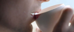 Tout à coup, le café les rappelle à un amour sensuel et magnétique. Portant chacun leurs lèvres sur la marque – visible ou pas – que l’autre a déposée, ils échangent un baiser intense par tasses interposées. L’intensité de l’arôme les rappelle à l’intensité du moment.
