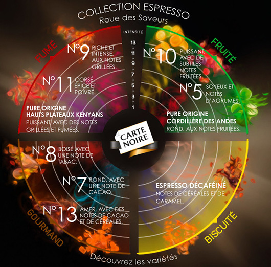 Fumé, gourmand, fruité, biscuité… Pour vous aider à trouver votre capsule préférée et aussi vous permettre de découvrir d’autres saveurs, CARTE NOIRE a créé LA ROUE DES SAVEURS, pour naviguer au sein de la gamme.