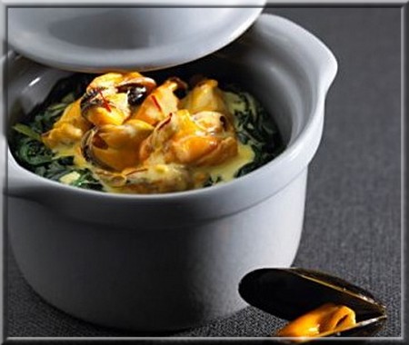 Dans un plat à oreilles, disposez un lit d'épinards, dessus, répartissez les moules et nappez de sauce.