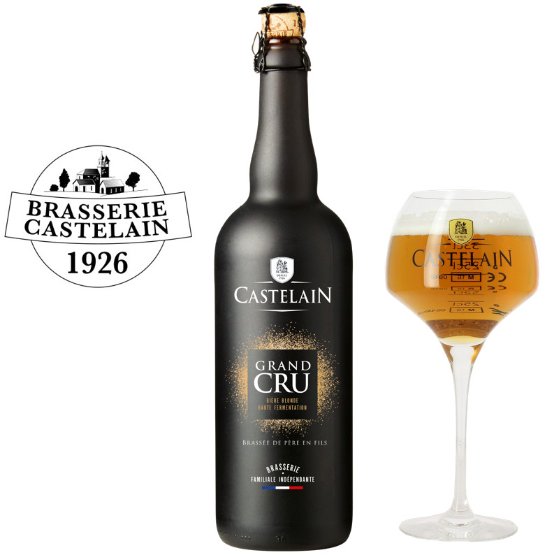 Reconnaissable à son élégante bouteille noir mat évoquant sa puissance et sa finesse gustative, la CASTELAIN Grand Cru répond aux attentes d’épicuriens exigeants, qui souhaitent prendre le temps pour apprécier la grande diversité de ses saveurs. Créée à l’occasion des 90ans de la brasserie, cette bière blonde de fermentation haute à la robe dorée surmontée d’un col de mousse généreux, s’adresse aux amateurs de bières de dégustation. Bulles fines et légères, goût affirmé, savant équilibre entre amertume fine et céréales, cette recette d’exception révèle avec justesse et élégance un savoir-faire au service d’un brassage de produits d’exception.