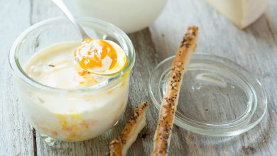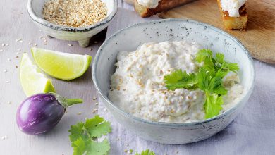 Longuets toastés, caviar d’aubergine au St Môret® et sésame grillé