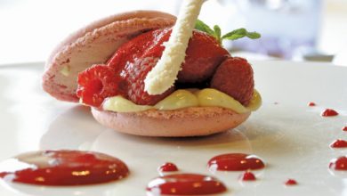 Macaron framboise, crème mousseline vanille et sorbet framboise