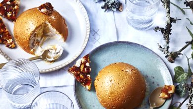 Dôme de mousse à la crème de marron, pommes et nougatine de noisettes
