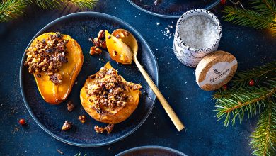 Poires rôties, crumble noix-noisettes et Fleur de sel Le Guérandais