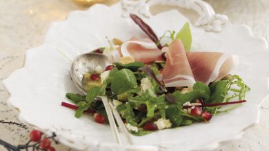 Salade de menthe, grenade, amandes grillées, Stilton blanc et Jambon de Parme