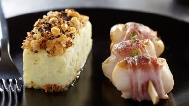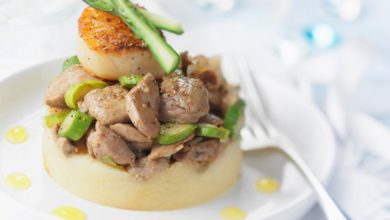 Aiguillettes de canard Montfort et noix de Saint-Jacques sur purée de céleri-rave