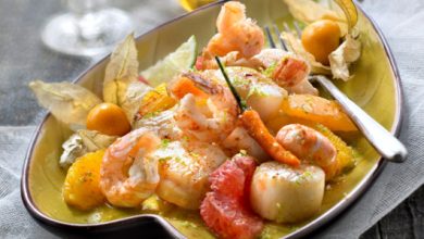 Méli mélo de Saint-Jacques et Langoustines rôties aux Agrumes, Huile Inca Inchi Bio Cauvin