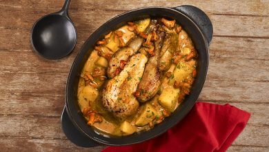 Pintade en cocotte à la crème et aux girolles