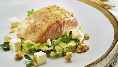 Saumon en croûte de noix et Chaource, fondue de poireaux