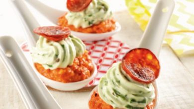 Cuillères apéritives Pesto de poivron rouge, chantilly de chèvre et roquette