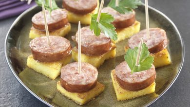 Carrés de polenta et tranches de Saucisse de Montbéliard caramélisées au miel
