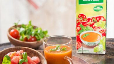 Soupe froide Tomate, Menthe & Basilic Alvalle® et tartare de pastèque et pignons