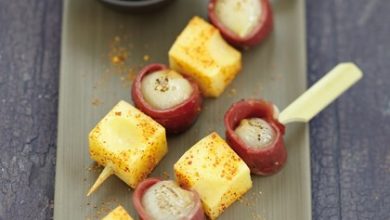 Brochettes de Canard Fumé, Petits Oignons Caramelisés et Emmental Grand Cru au Piment d’Espelette