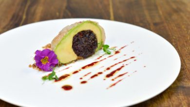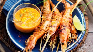 Gambas cuites à l’olive, guacamole de pruneaux d’Agen et avocat