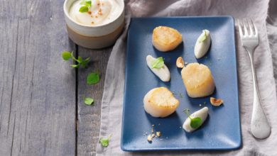 Noix de Saint-Jacques rôties aux noisettes et crémeuse de topinambours au St Môret®