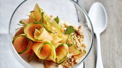 Panna cotta coco, fraicheur de melon du Haut-Poitou à la menthe, sablé breton