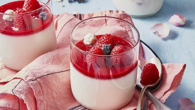 Panna cotta à la Crème Fraîche Chavroux®, à l’eau de rose et coulis de framboise
