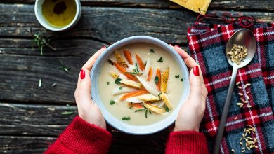 Velouté de chou-fleur aux éclats de noisettes et chips de jambon cru Aoste