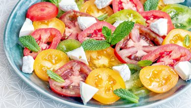 Carpaccio de tomates colorées au Sainte-Maure-de-Touraine AOP, menthe et petits croûtons