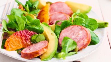 Salade de mâche, orange sanguine et saucisse de Montbéliard