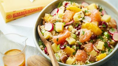 Salade de boulgour, suprêmes d’agrumes, dés de céleri, radis roses, dés d’Emmentaler® AOP Suisse