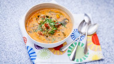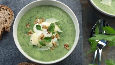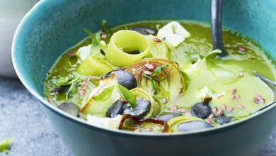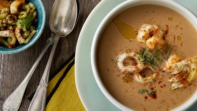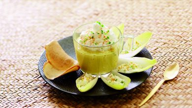 Soupe glacée de melon à la coriandre et topping de galettes au tofu à l’indienne