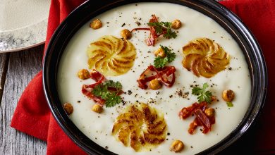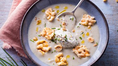 Velouté de topinambour, ricotta aux olives, éclats de Galettes de Maïs