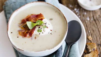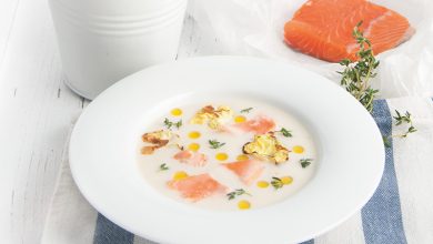 Velouté de chou-fleur au saumon de Norvège, aux choux de Bruxelles et au thym