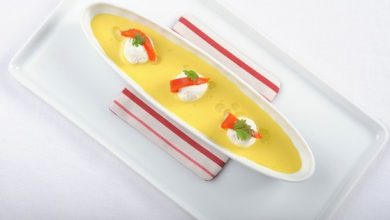 Crème de Maïs au Curcuma, Bille de Ricotta et Poivron Doux